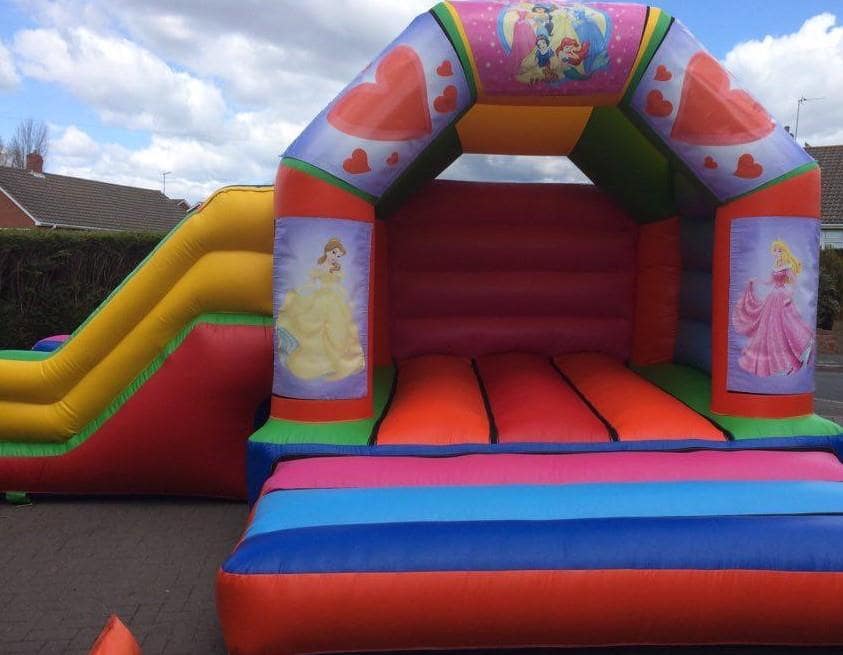The side slide combo bouncy castle is popular, with bouncy castle area and with a slide on the side for extra fun, It also has a shower/sun cover. With the added benefit of the slide coming off the side making it an ideal for bigger gardens and parties in Halls
