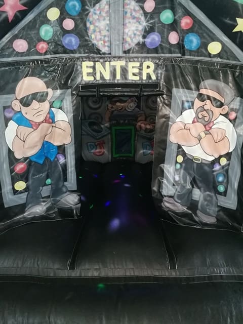 It has great fun artwork with bright colours; in a disco feel, even artwork inside, with your very own DJ. Enclosed front which can be taken off so to open up the bouncy castle. It comes set up with disco lights inside and a music system so you can blue tooth you own favourite music from your chosen device, eg smart phone, iPod etc, anything with blue tooth. It will be delivered and set up with safety mats, cables and electric blower, and safety tests done by our professional staff before we leave, so to make sure you are happy with where and how your bouncy castle is set up. We can deliver and set up at times to suit you in a venue. Please leave a note of the time you get the room and what time your party starts and ends. If in your own garden times are between 7.30am-12 noon and collections start from 6pm unless you wanted it collecting before, You can arrange this when we set up your bouncy castle..