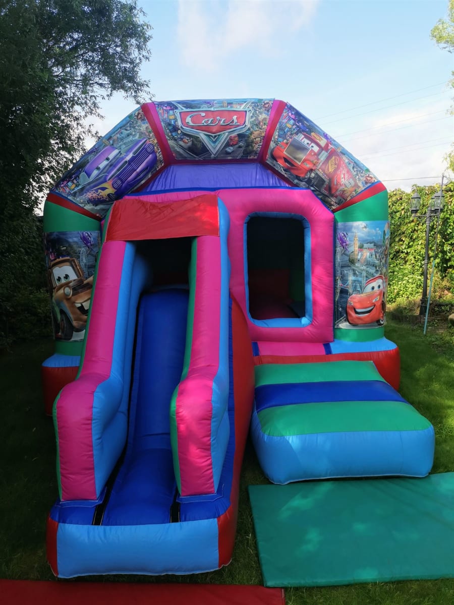 The front slide combo bouncy castle is very popular, with bouncy castle area and with a slide on the front for those smaller gardens, It also has a shower/sun cover. With the added benefit of the slide coming off the front making it ideal for slimmer gardens and parties in Halls.