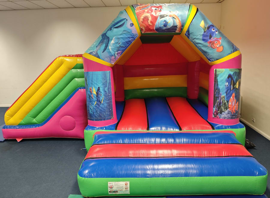 The side slide combo bouncy castle is popular, with bouncy castle area and with a slide on the side for extra fun, It also has a shower/sun cover. With the added benefit of the slide coming off the side making it an ideal for bigger gardens and parties in Halls.