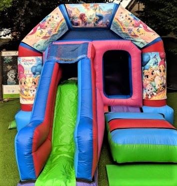 The front slide combo bouncy castle is very popular, with bouncy castle area and with a slide on the front for those smaller gardens, It also has a shower/sun cover. With the added benefit of the slide coming off the front making it ideal for slimmer gardens and parties in Halls.