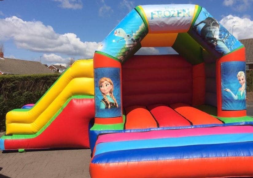 The side slide combo bouncy castle is popular, with bouncy castle area and with a slide on the side for extra fun, It also has a shower/sun cover. With the added benefit of the slide coming off the side making it an ideal for bigger gardens and parties in Halls