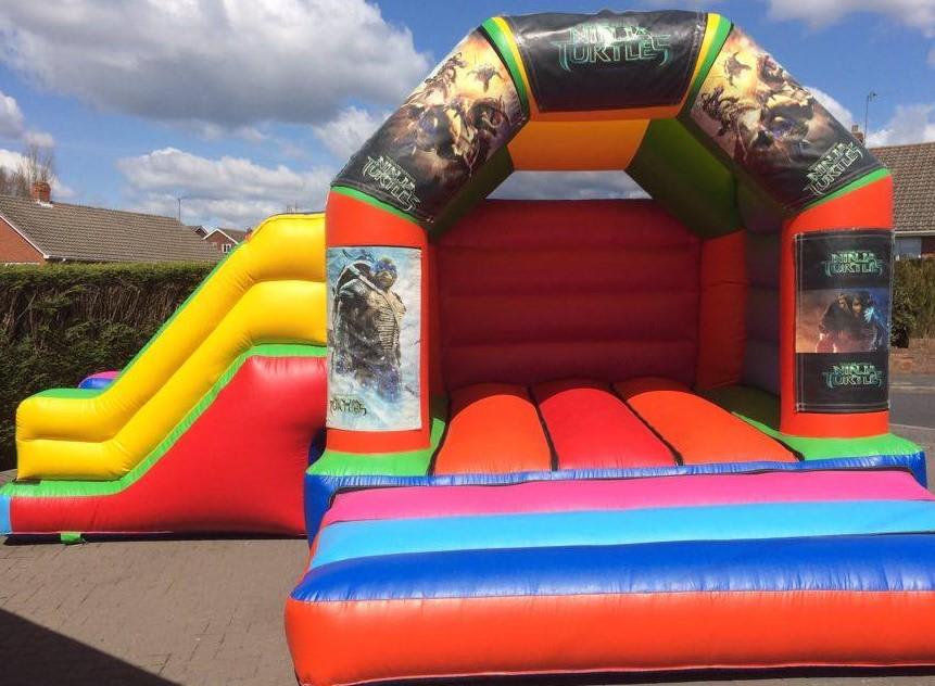 The side slide combo bouncy castle is popular, with bouncy castle area and with a slide on the side for extra fun, It also has a shower/sun cover. With the added benefit of the slide coming off the side making it an ideal for bigger gardens and parties in Halls.