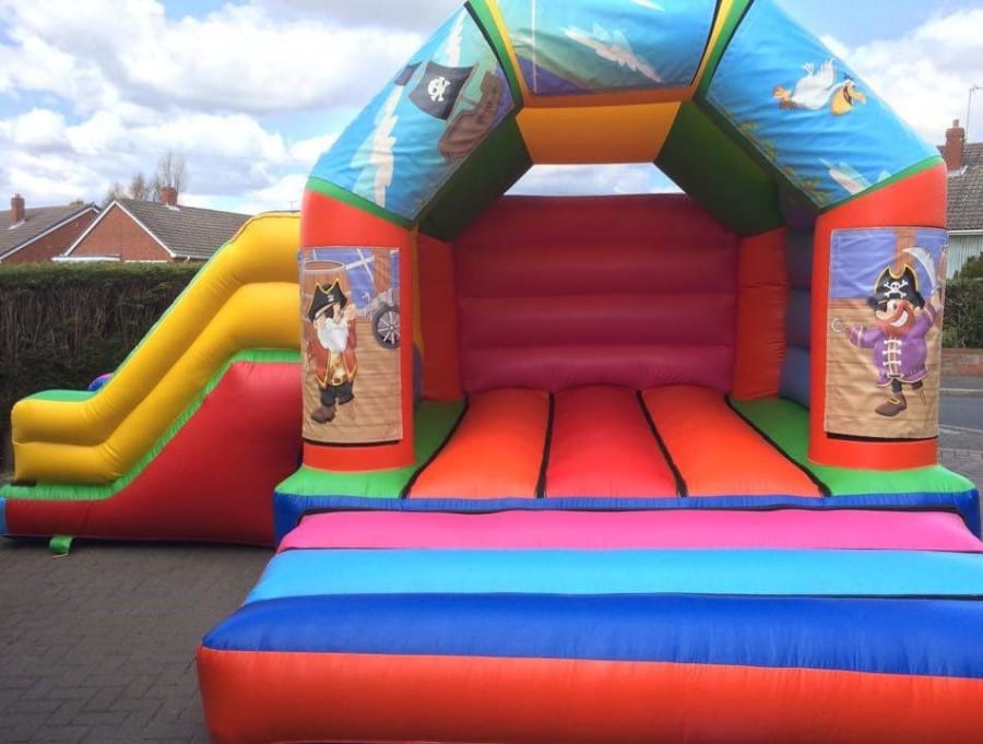 The side slide combo bouncy castle is popular, with bouncy castle area and with a slide on the side for extra fun, It also has a shower/sun cover. With the added benefit of the slide coming off the side making it an ideal for bigger gardens and parties in Halls