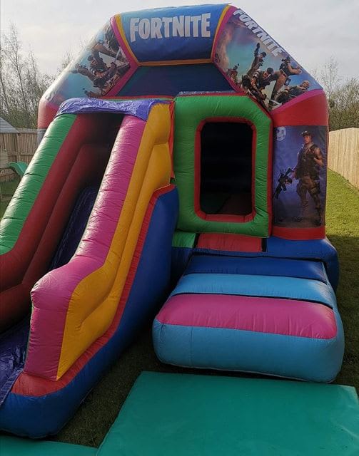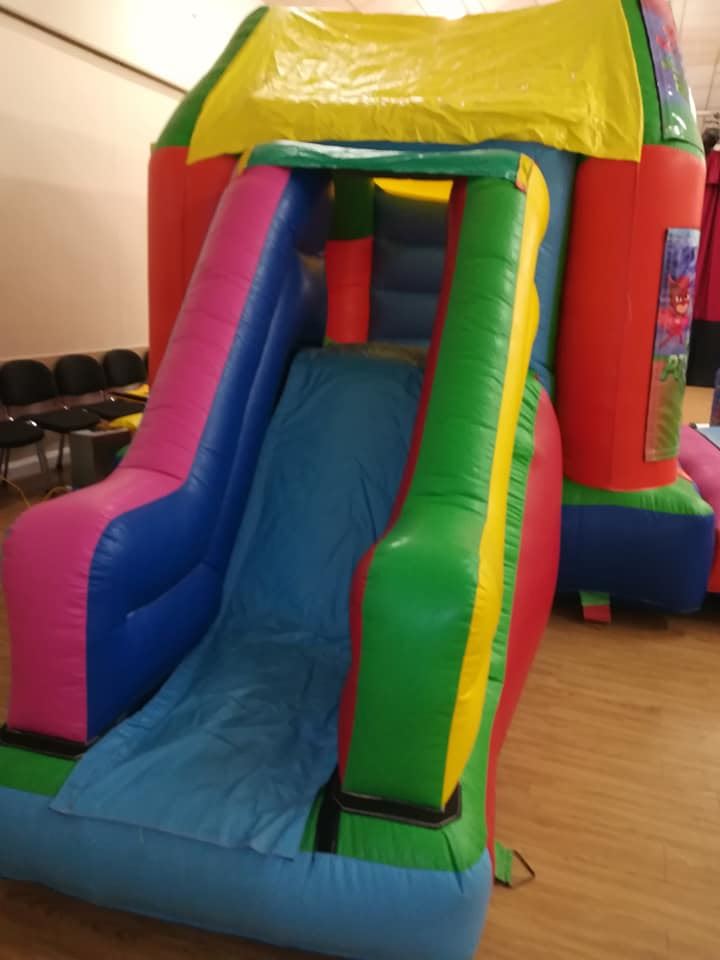 The front slide combo bouncy castle is very popular, with bouncy castle area and with a slide on the front for those smaller gardens, It also has a shower/sun cover. With the added benefit of the slide coming off the front making it ideal for slimmer gardens and parties in Halls as the height is under 10ft.