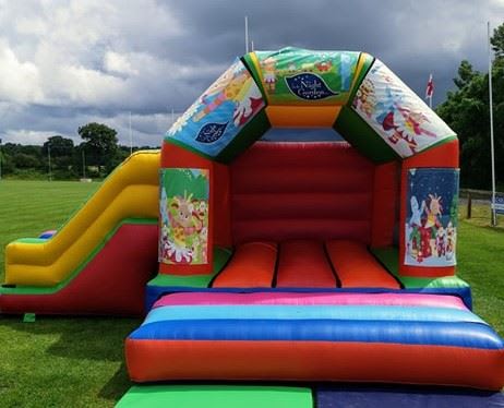 The side slide combo bouncy castle is popular, with bouncy castle area and with a slide on the side for extra fun, It also has a shower/sun cover. With the added benefit of the slide coming off the side making it an ideal for bigger gardens and parties in Halls.