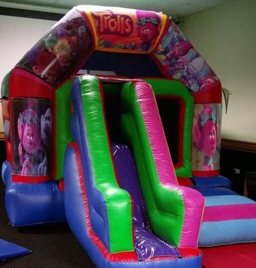 The front slide combo bouncy castle is very popular, with bouncy castle area and with a slide on the front for those smaller gardens, It also has a shower/sun cover. With the added benefit of the slide coming off the front making it ideal for slimmer gardens and parties in Halls