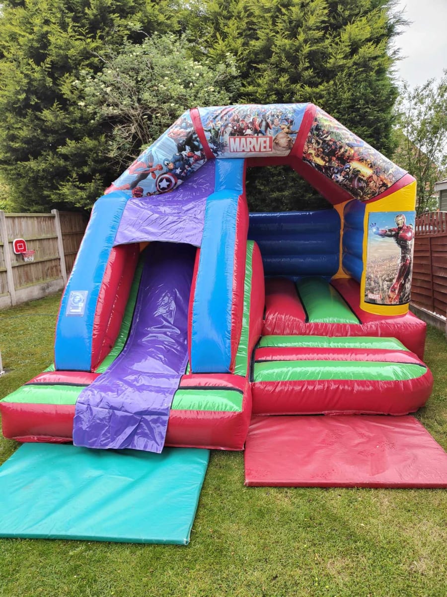 The front slide combo bouncy castle is very popular, with bouncy castle area and with a slide on the front for those smaller gardens, It also has a shower/sun cover. With the added benefit of the slide coming off the front making it ideal for slimmer gardens and parties in Halls