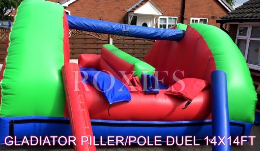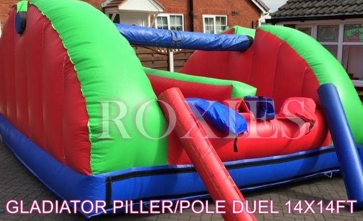 Gladiator Duel for hire in Cannock Chase areas of South Staffordshire, from Roxies Bouncy Castle Hire, The 14x14ft Gladiator Duel is great at any Event or garden Party or for any occasion. It comes with free local delivery or a small charge to further areas. Set up collection cables, safety mats, poles and pillars are also included. Just need your power supply and you supply the fun.